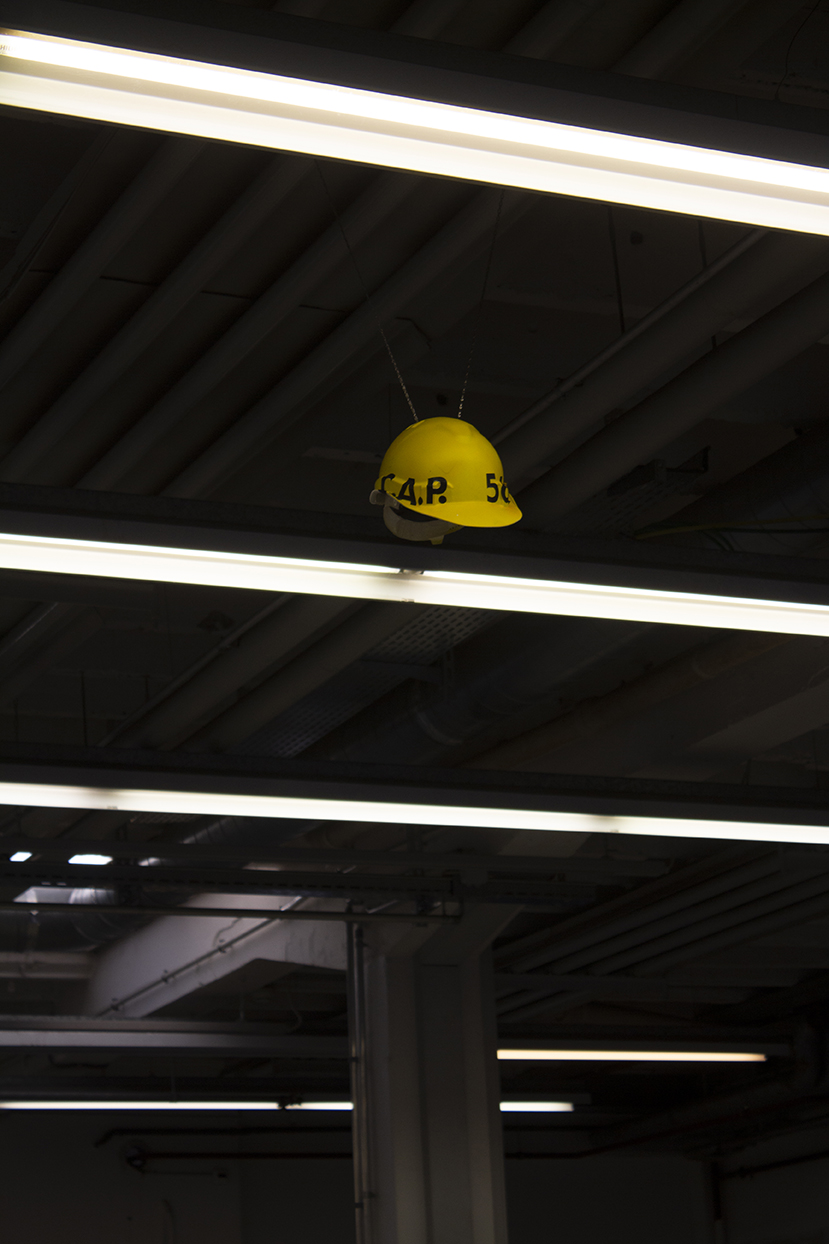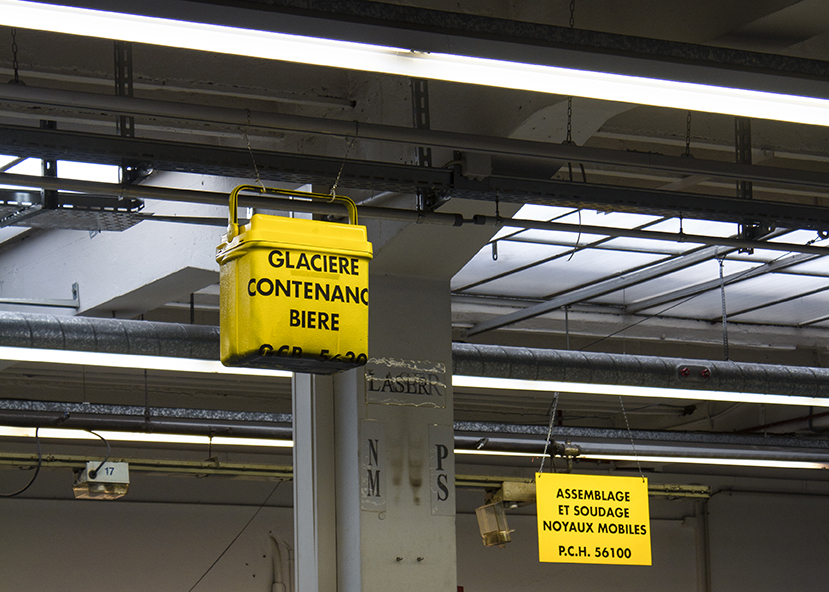 Installation d'une signalétique artistique dans une usine désaffectée avec des objets trouvés in-situ.